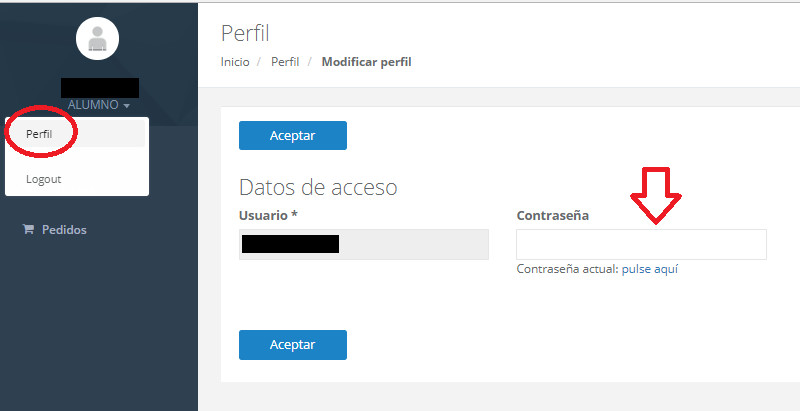 Para acceder, tanto por ordenador como en la aplicación, debes pedir a tu profesor que te registre como nuevo alumno. Una vez hecho te proporcionará un nombre de usuario y una contraseña, la cual podrás cambiar en tu perfil: